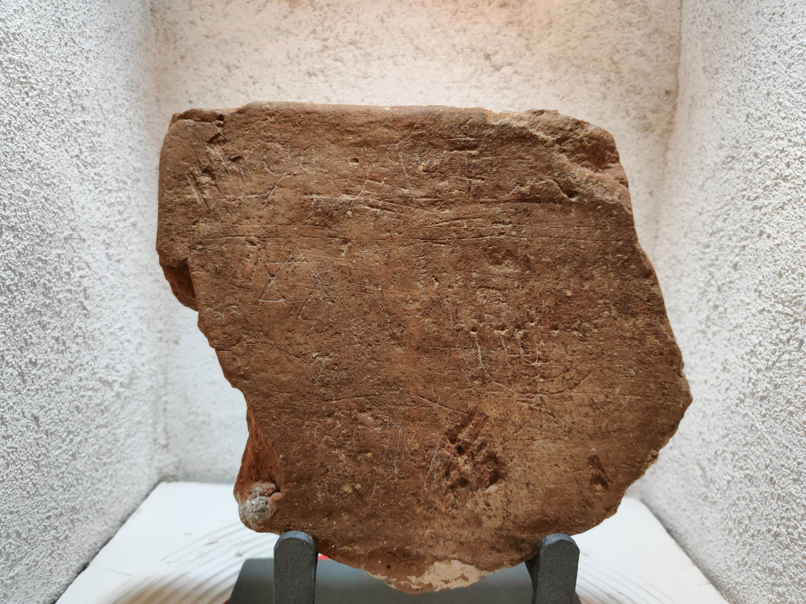 Laterizio con incisi i simboli del culto ebraico, la stella di David e il candelabro a sette bracci.